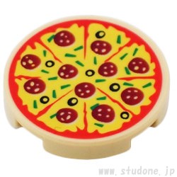 | Item Name | Tile, Round 2 x 2 with Bottom Stud Holder with Pizza Pepperoni and Olive with Slice Marks Pattern |