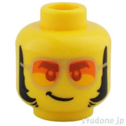 Item Name | Minifigure, Head Dark Orange Eyebrows and Eyes, Gold Sunglasses with Orange Lenses, Black Thick Sideburns, Lopsided Grin Pattern |