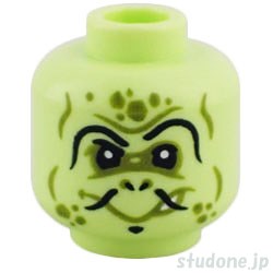 Item Name | Minifigure, Head Alien Thin Curved Black Eyebrows, Fu Manchu Moustache, and Olive Green Wrinkles and Spots Pattern |