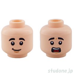 Item Name | Minifigure, Head Dual Sided Black Thick Eyebrows, Medium Nougat Chin Dimple, Lopsided Grin / Scared Open Mouth with Top Teeth and Red Tongue Pattern |