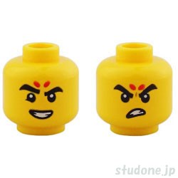 Item Name | Minifigure, Head Dual Sided Thick Black Eyebrows, 2 Red Spots, Eyebrow Raised and Open Mouth Smile with Teeth / Angry Pattern |