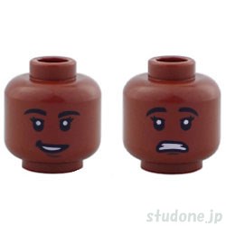 | Item Name | Minifigure, Head Dual Sided Female, Black Eyebrows, Dark Brown Chin Dimple, Open Mouth, Lopsided Smile / Scared Pattern |