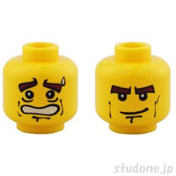 | Item Name | Minifigure, Head Dual Sided Thick Brown Eyebrows, Cheek Lines, Determined with Grin / Sweat Drop and Scared Open Mouth Pattern |