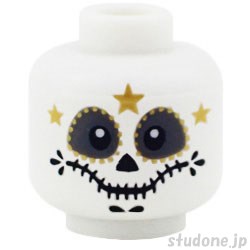 | Item Name | Minifigure, Head Alien El Catrín with Black Triangular Nose, Stitched Mouth, Dark Bluish Gray Eye Shadow, Gold Face Paint with 3 Stars Pattern (BAM) |