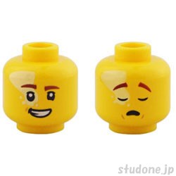 | Item Name | Minifigure, Head Dual Sided Reddish Brown Eyebrows, Bright Light Yellow Splotch, Open Mouth Smile with Teeth / Sleeping Pattern (BAM) |