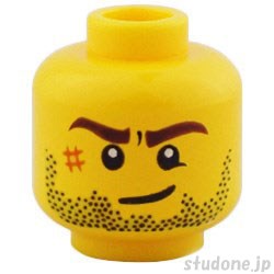 | Item Name | Minifigure, Head Dark Brown Eyebrows, Black Beard Stubble, Dark Orange Scuff Mark, Lopsided Grin Pattern |